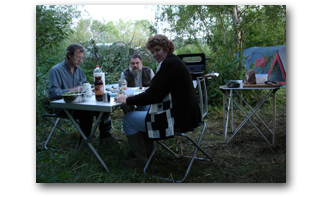 Angelurlaub: Aufstehen viertel nach sieben, Frühstück mit J. bei B. Bauhof wegen Motorsense. 3 qm gesenst, Sense! B. zum Bauhof, die Kollegen lang machen. Gefühlte 2 Tonnen Ausrüstung auf die Insel geschleppt. Wieder gesenst, drei Zelte aufgebaut, einkaufen! Schnelles Weizen im Schwimmbad. B.'s I. zum grillen eingeladen. Zurück, Fleisch mariniert, Salat angemacht. J. montiert den Lavasteingrill, noch original verpackt, natürlich fehlt Werkzeug.