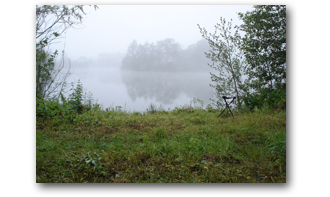 Morgennebel über dem See. Anglerfrühstück, Kaffee und Pfeife. Bis Mittags montiert. Endlich ... die Angeln beködert und ausgeworfen. Sonne satt! Nachmittags mit Sonnenbrand, dafür noch ohne Fisch.