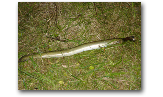 Bei Sonnenuntergang Anbiss! Braxe, 15 cm., große Fische sehen anders aus! Schnurknoten! Feierabend! Grundangel eindrehen! Widerstand..., mehr Widerstand ... - Hilfe, See droht mit Fisch! Kurzer Drill. Schau an, ein Aal. 71 cm, Schonmaß ist 50, Glück gehabt. Aal geht also, Braxe auch und Schleie?