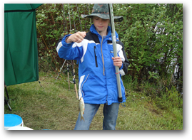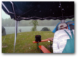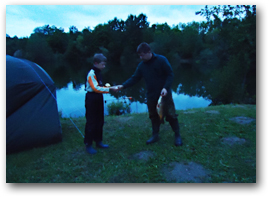 Sonntag, das erste gemeinsame Frühstück. Noch scheint die Sonne, aber schon am Spätnachmittag fängt es an: Starkregen und Hagel. Bis Fronleichnam wird sich daran nicht viel ändern. Aber mit dem Regen kommen auch die Fische. Der Ziel- ist ein Raub-Fisch, doch zunächst gibt es nur Karpfen, einen kapitalen Barsch und einen untermaßigen Hecht.