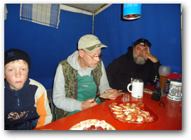 Tagsüber wird es selten wärmer als 18°C und wir machen schon Nachmittags die Heizung im Mannschaftszelt an. Da sitzen wir dann gemütlich beim Bier und einigen Leckereien, die M. liebevoll auftischt und starren gebannt auf unsere Funkbißanzeiger. Wenn es brummt, pfeift, klingelt oder leuchtet stürzen alle in den Regen und schlittern durch den Matsch an die Rute, die den Alarm ausgelöst hat. Fast sind wir enttäuscht, immer wieder Karpfen.