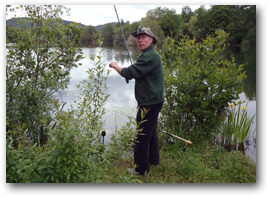 Das geht so weiter, bis S. zu uns stößt, einer der Junganler aus der Nachbarschaft, die sich unserer Obhut anvertraut haben. Der zeigt uns, dass es auch große Hechte im Teich gibt. Er zieht mit D. um den See und beide bringen uns je einen Hecht, der sich sehen lassen kann.