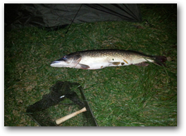 Als ich an der Angelstelle von D. und M. ankomme, hat M. den Fisch schon ziemlich bis ans Ufer gedrillt. Dass es etwas großes ist, lässt der Schwall erkennen aber was genau? Erst im letzten Moment erkennen wir den riesigen charakteristischen Kopf: Esox ist in M.'s rafinierte Falle gegangen! - Gewogen und gemessen liegen ein Meter zehn bzw. neun Kilo Fisch zu unseren Füßen. Diese Nacht wird noch etwas länger dauern.