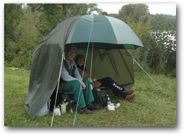 Auch am Sonntag ist das Wetter noch recht angenehm, wenn auch frisch. Die Fangergebnisse sind mäßig, gut nur, dass es gelegentlich noch unersättliche Barsche gibt. Essen gibts an Sonn- und Feiertagen schon um zwölf, das ist gut für mich, denn am Nachmittag rutsche ich am Seeufer aus, verstauche mir böse den rechten Arm und falle bis zum nächsten Mittag aus. B. hat inzwischen die Heizungen mit gebracht also haben wir es in den Abendstunden nicht nur trocken, sondern auch warm in unserer Pergola.